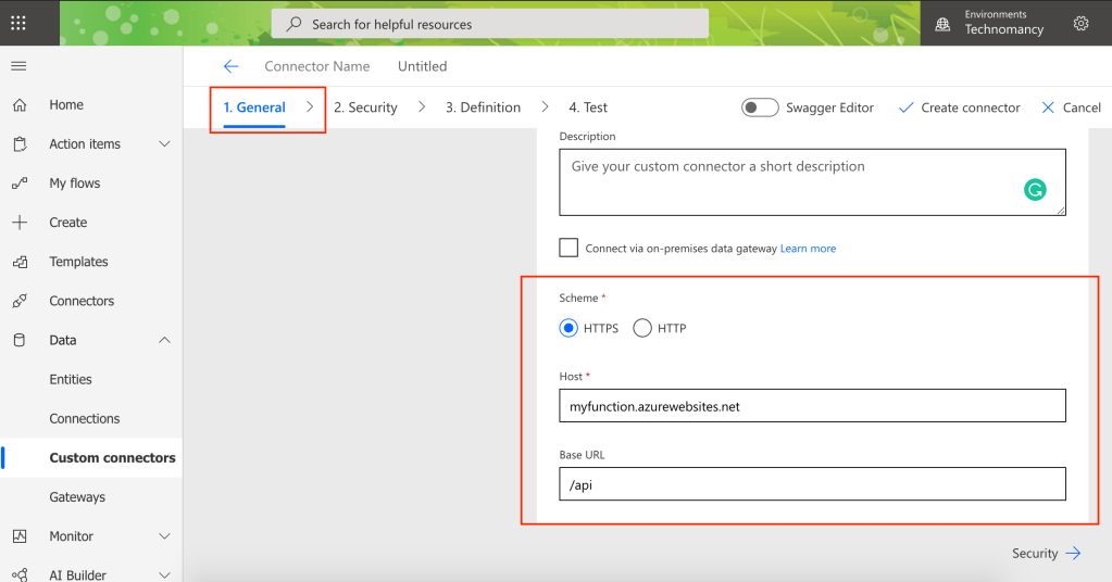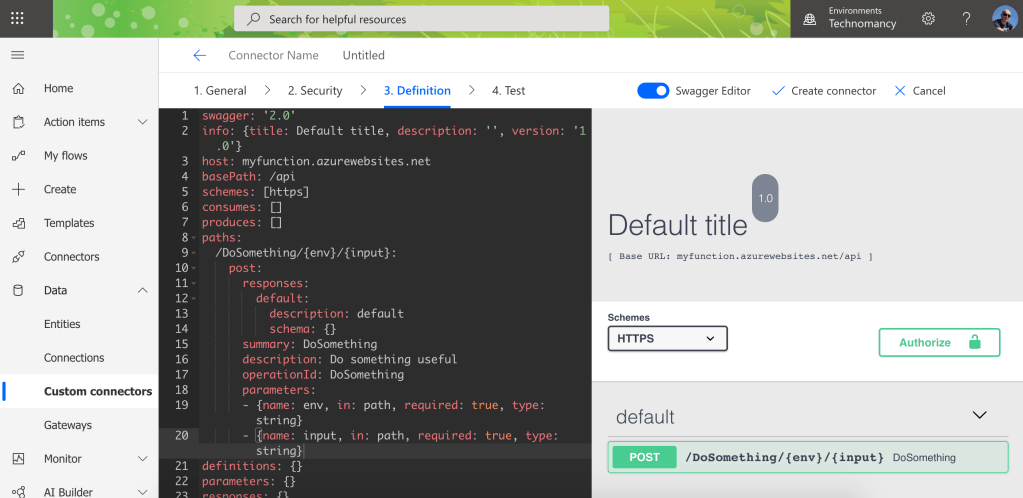 This is a bit of a problem for Power Platform custom connector as it requires the domain to be the part of the definition and this is not parametrised! What it means, that you cannot have the ability to specify the varying on environments domain part as a parameter.