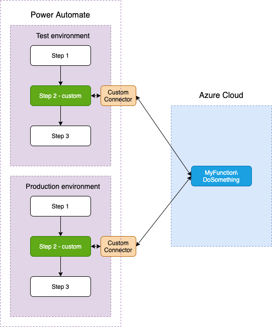 Working with real customer’s deployment requires managing multiple environments – at least Test and Production or additionally a Dev environment. One of the common patterns we use in the solutions is to use Azure Functions as an effective, serverless extension of the point-and-click Power Automate flows. This pattern utilises a Custom Connector created to embed the function call and parameters into the flow. This pattern is described in a bit more detail in another post, but here is a quick picture if we use one environment: