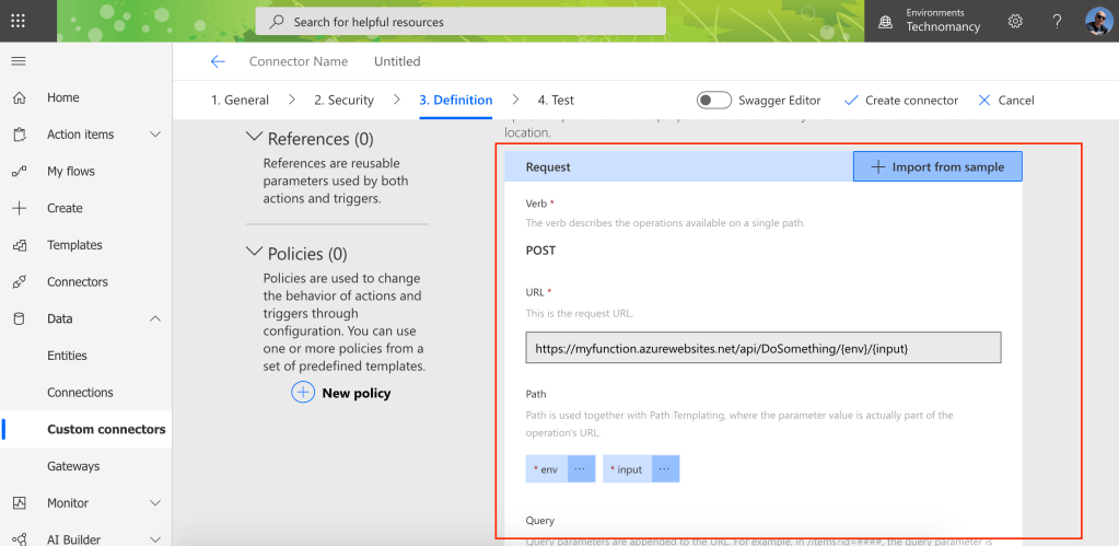 - In the Power Platform’s custom connector use a connection (ideally) or a parameter (as a quick fix) to differentiate environments. This means that on deployment you’d need only to change the parameter or select the connection.