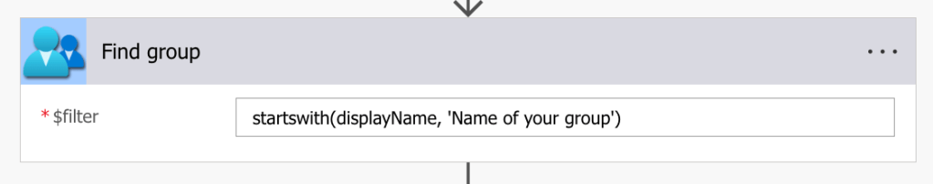 To find an existing group by name, use the “Find group” action and specify the filtering criteria (see an example here for more information):