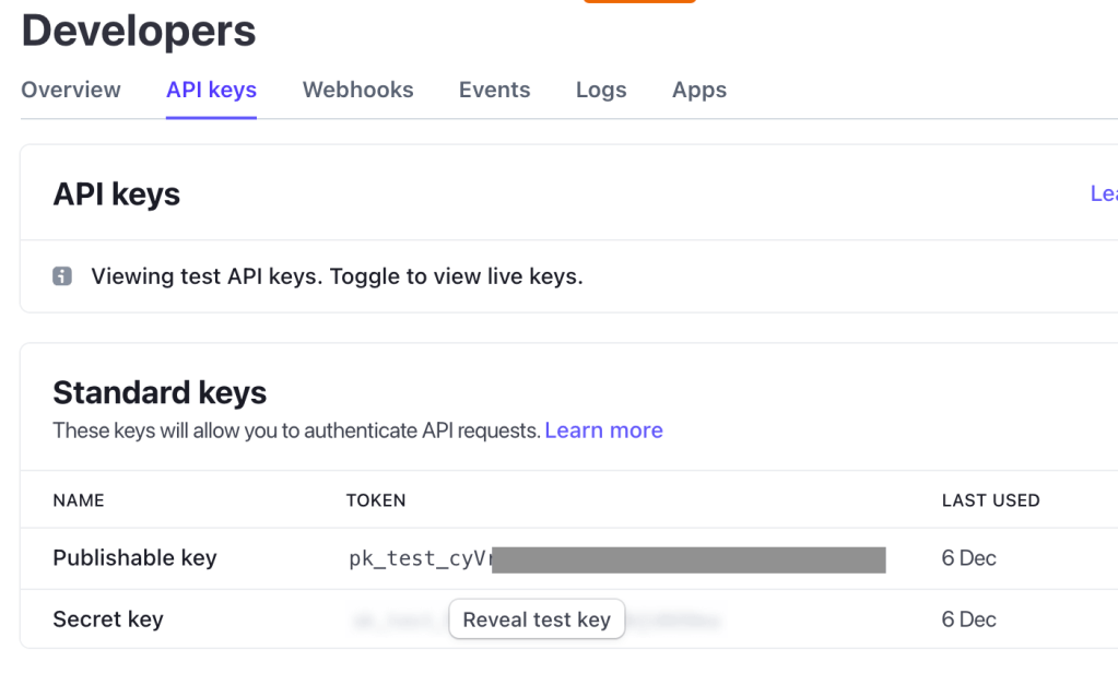 Once restarted, you can set up the keys required for the Stripe integration, as the documentation here. You need to have a Stripe developer account and then you can get your “Publishable key” and “Secret key” from the developers sections there: