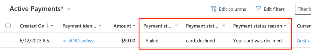 By triggering the failed payment again, we can observe (in a basic model drive app I trust you to implement) the data captured as below: