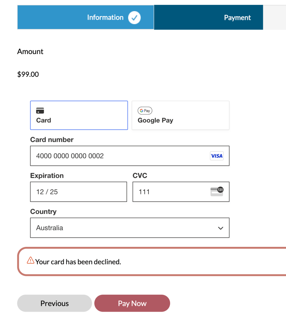 If you followed the official documentation or the helpful video by Nick Doelman, you should have the Stripe payment page in your Power Pages portal set up already. Let’s use it to trigger a failed payment. You need to initiate a payment using a test Stripe card (e.g. 4000 0000 0000 0002). As expected, it will fail, displaying an error to the user on the front end: