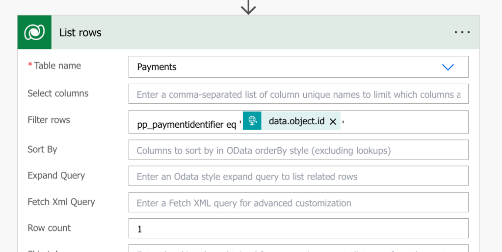 Remove the “Compose” action; it served us well. As the next step of the cloud flow, we will find the record in the Payment table that has the “Payment identifier” field value as the payment intent reference from the webhook request data: triggerBody()?['data']?['object']?['id']