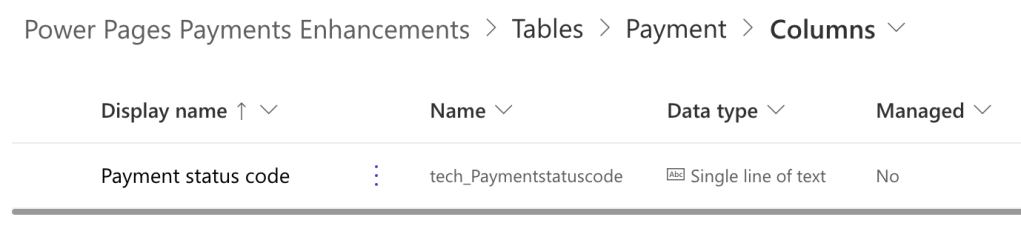 I added to the solution an existing “Payment” table and a new column “Payment status code” (single line of text). I will use this and the other two existing columns on the table to capture the payment processing result.