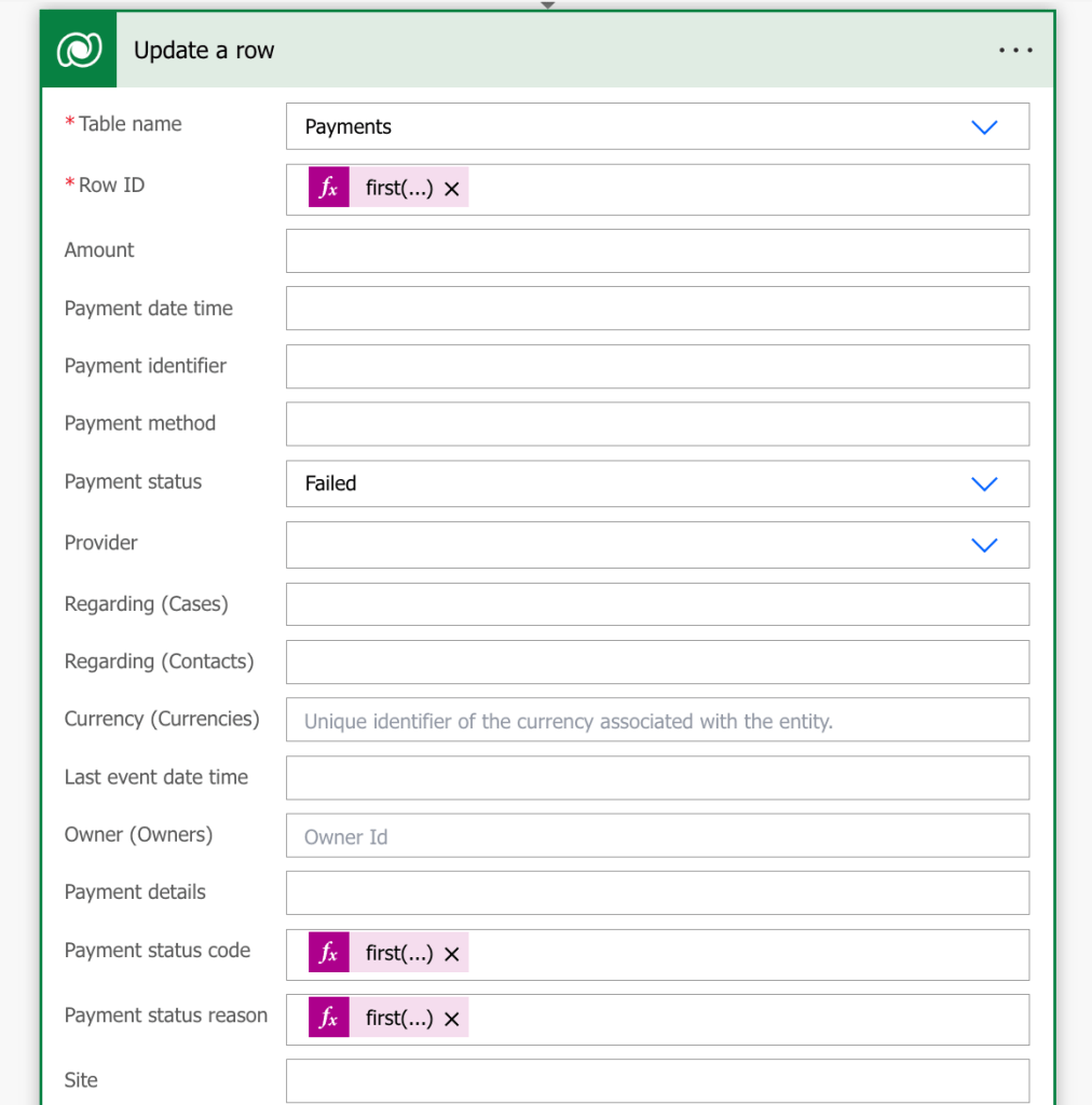 first(outputs('List_rows')?['body/value'])?['pp_paymentid'] - Payment status –