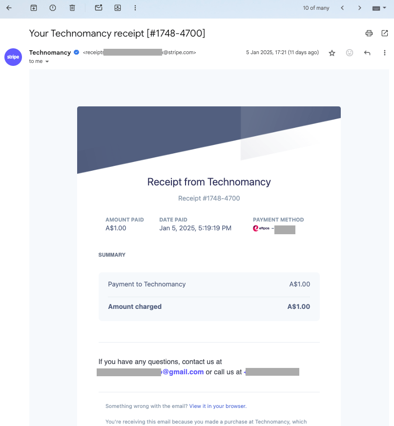 The other complication is that Stripe sends email receipts only in “live” (production) mode keys, according to the Stripe documentation on Email receipts and paid invoices. So, technically, you cannot test this solution end to end with an emailed receipt sent without an actual payment.